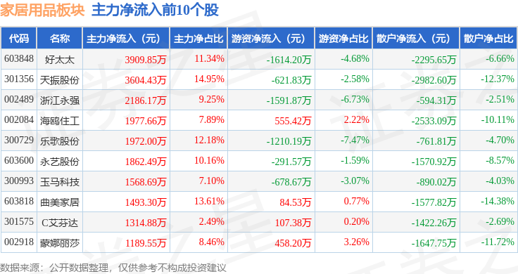 从资金流向上来看,当日家居用品板块主力资金净流入8117.62万元,游资资金净流出1.15亿元,散户资金净流入3351.69万元。家居用品板块个股资金流向见下表: