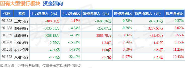 从资金流向上来看,当日国有大型银行板块主力资金净流出12.29亿元,游资资金净流入5.1亿元,散户资金净流入7.19亿元。国有大型银行板块个股资金流向见下表: