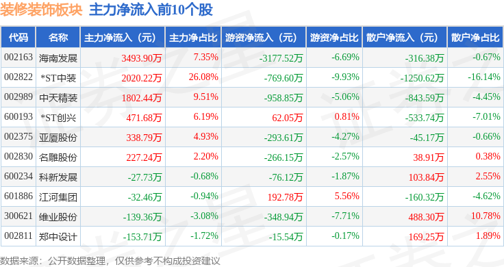 从资金流向上来看,当日装修装饰板块主力资金净流出1.09亿元,游资资金净流入2438.52万元,散户资金净流入8508.69万元。装修装饰板块个股资金流向见下表: