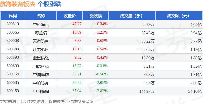 证券之星消息,9月16日航海装备板块较上一交易日上涨40.79%,中科海讯领涨。当日上证指数报收于3861.87,上涨0.04%。深证成指报收于13063.97,上涨0.45%。航海装备板块个股涨跌见下表: