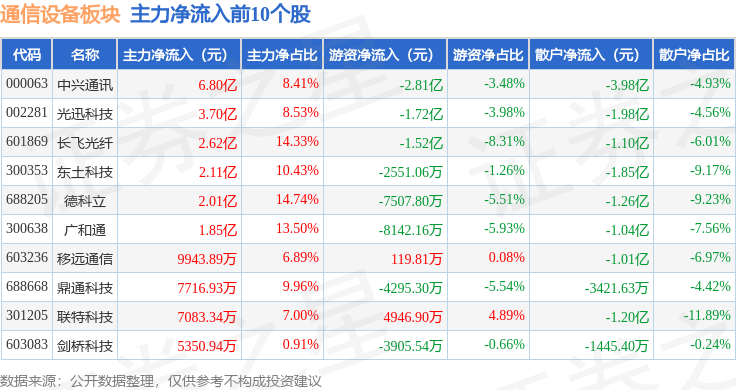 从资金流向上来看,当日通信设备板块主力资金净流出26.57亿元,游资资金净流入3.53亿元,散户资金净流入23.04亿元。通信设备板块个股资金流向见下表: