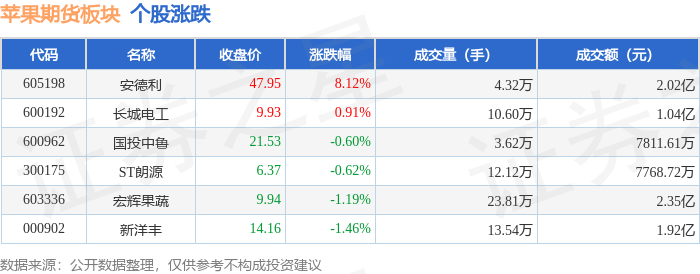 证券之星消息,9月16日苹果期货板块较上一交易日上涨1.37%,安德利领涨。当日上证指数报收于3861.87,上涨0.04%。深证成指报收于13063.97,上涨0.45%。苹果期货板块个股涨跌见下表: