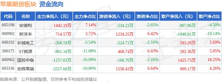 从资金流向上来看,当日苹果期货板块主力资金净流出2887.57万元,游资资金净流入2333.77万元,散户资金净流入553.79万元。苹果期货板块个股资金流向见下表: