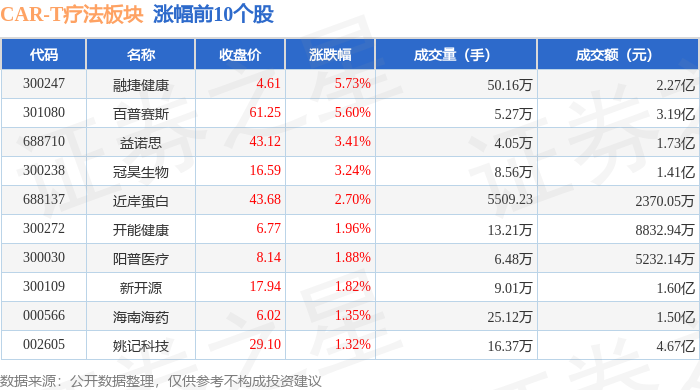 证券之星消息,9月16日CAR-T疗法板块较上一交易日下跌0.11%,*ST绿康领跌。当日上证指数报收于3861.87,上涨0.04%。深证成指报收于13063.97,上涨0.45%。CAR-T疗法板块个股涨跌见下表: