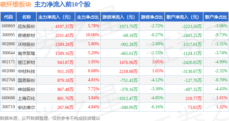从资金流向上来看,当日碳纤维板块主力资金净流出6.72亿元,游资资金净流入1.5亿元,散户资金净流入5.22亿元。碳纤维板块个股资金流向见下表: