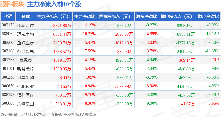 从资金流向上来看,当日眼科板块主力资金净流出3.8亿元,游资资金净流入2.27亿元,散户资金净流入1.53亿元。眼科板块个股资金流向见下表: