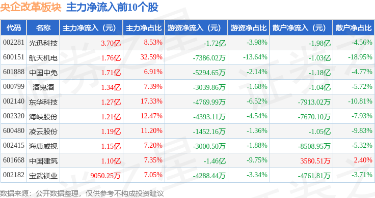 从资金流向上来看,当日央企改革板块主力资金净流出113.32亿元,游资资金净流入23.09亿元,散户资金净流入90.23亿元。央企改革板块个股资金流向见下表: