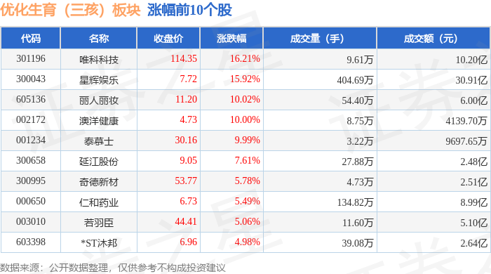 证券之星消息,9月16日优化生育(三孩)板块较上一交易日上涨0.49%,唯科科技领涨。当日上证指数报收于3861.87,上涨0.04%。深证成指报收于13063.97,上涨0.45%。优化生育(三孩)板块个股涨跌见下表: