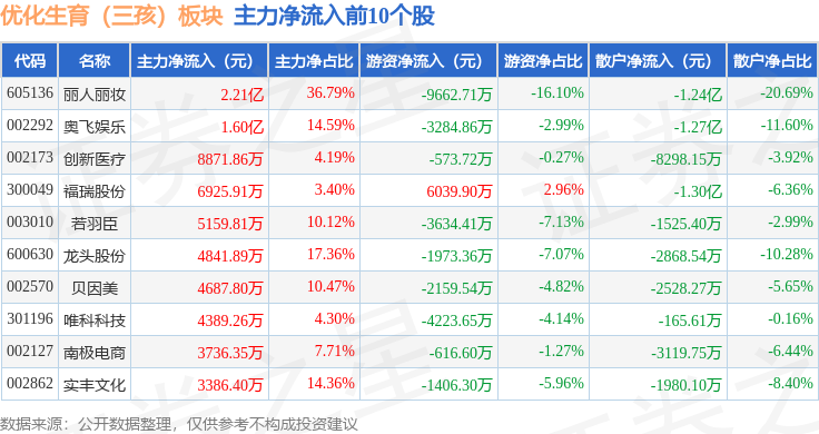 从资金流向上来看,当日优化生育(三孩)板块主力资金净流出3.58亿元,游资资金净流入6648.16万元,散户资金净流入2.92亿元。优化生育(三孩)板块个股资金流向见下表: