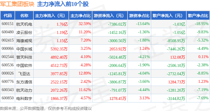 从资金流向上来看,当日军工集团板块主力资金净流出39.04亿元,游资资金净流入3.25亿元,散户资金净流入35.79亿元。军工集团板块个股资金流向见下表: