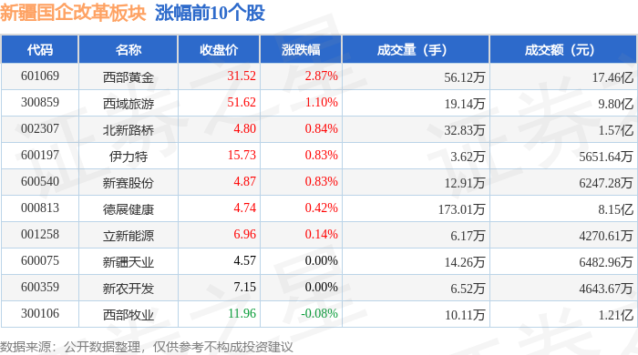 证券之星消息,9月16日新疆国企改革板块较上一交易日下跌0.06%,*ST中基领跌。当日上证指数报收于3861.87,上涨0.04%。深证成指报收于13063.97,上涨0.45%。新疆国企改革板块个股涨跌见下表: