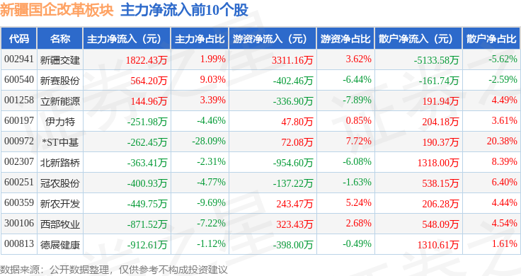 从资金流向上来看,当日新疆国企改革板块主力资金净流出5.26亿元,游资资金净流入7744.91万元,散户资金净流入4.49亿元。新疆国企改革板块个股资金流向见下表: