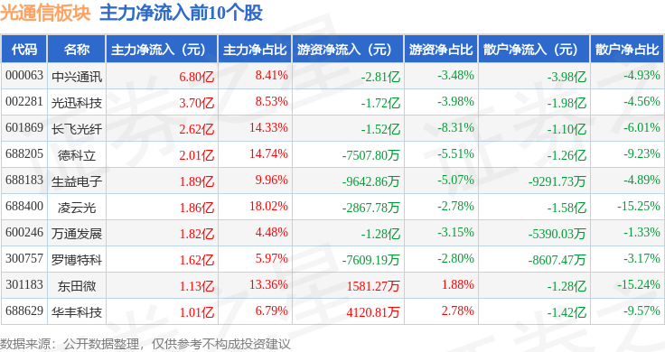 从资金流向上来看,当日光通信板块主力资金净流出42.14亿元,游资资金净流入9.93亿元,散户资金净流入32.2亿元。光通信板块个股资金流向见下表: