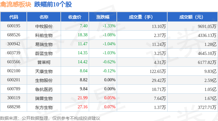 证券之星消息,9月16日禽流感板块较上一交易日上涨0.51%,亨通股份领涨。当日上证指数报收于3861.87,上涨0.04%。深证成指报收于13063.97,上涨0.45%。禽流感板块个股涨跌见下表: