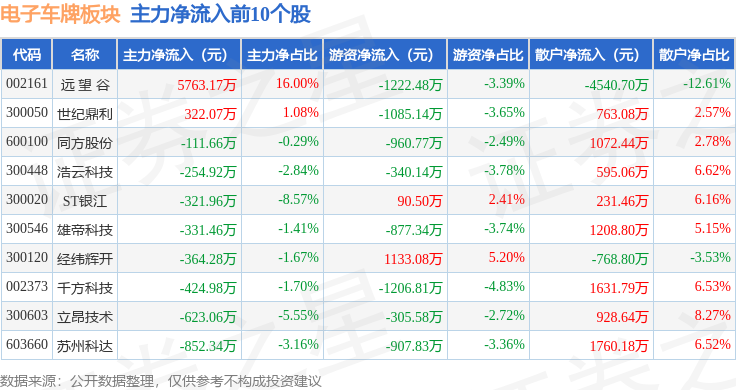 从资金流向上来看,当日电子车牌板块主力资金净流出1.4亿元,游资资金净流出6042.79万元,散户资金净流入2.0亿元。电子车牌板块个股资金流向见下表: