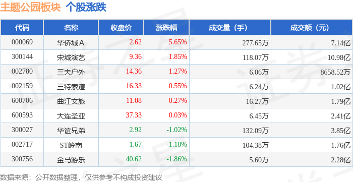 证券之星消息,9月16日主题公园板块较上一交易日上涨1.82%,华侨城A领涨。当日上证指数报收于3861.87,上涨0.04%。深证成指报收于13063.97,上涨0.45%。主题公园板块个股涨跌见下表: