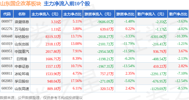 从资金流向上来看,当日山东国企改革板块主力资金净流出11.92亿元,游资资金净流出7022.11万元,散户资金净流入12.62亿元。山东国企改革板块个股资金流向见下表: