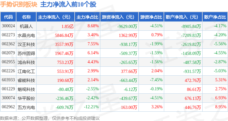 从资金流向上来看,当日手势识别板块主力资金净流出7795.61万元,游资资金净流出8014.78万元,散户资金净流入1.58亿元。手势识别板块个股资金流向见下表: