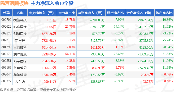 从资金流向上来看,当日民营医院板块主力资金净流出1.74亿元,游资资金净流出3310.3万元,散户资金净流入2.07亿元。民营医院板块个股资金流向见下表: