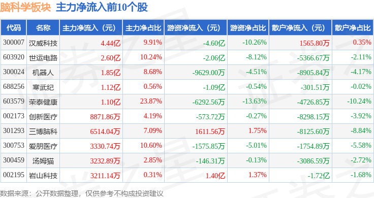 从资金流向上来看,当日脑科学板块主力资金净流入3.3亿元,游资资金净流出4.63亿元,散户资金净流入1.33亿元。脑科学板块个股资金流向见下表: