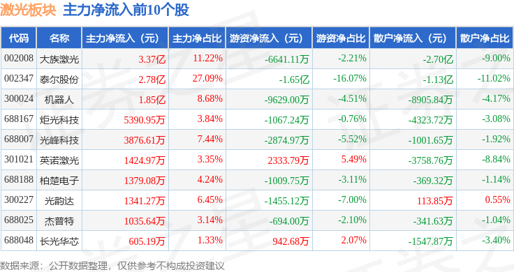 从资金流向上来看,当日激光板块主力资金净流出10.74亿元,游资资金净流出4564.3万元,散户资金净流入11.19亿元。激光板块个股资金流向见下表: