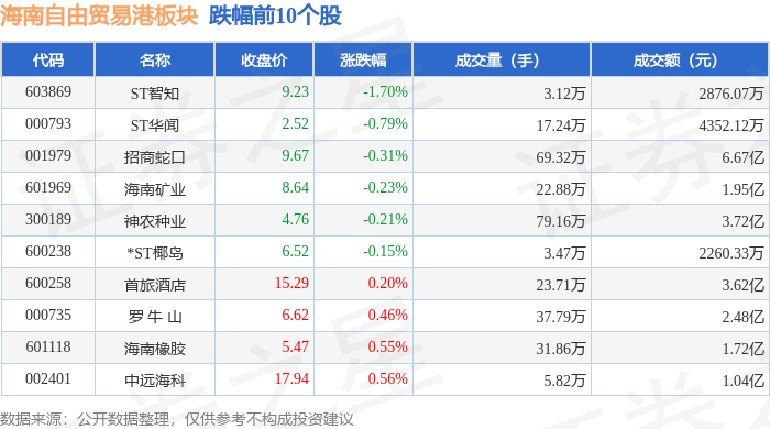 从资金流向上来看,当日海南自由贸易港板块主力资金净流入2.94亿元,游资资金净流出1.76亿元,散户资金净流出1.17亿元。海南自由贸易港板块个股资金流向见下表: