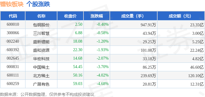 证券之星消息,9月16日镨钕板块较上一交易日下跌2.93%,广晟有色领跌。当日上证指数报收于3861.87,上涨0.04%。深证成指报收于13063.97,上涨0.45%。镨钕板块个股涨跌见下表: