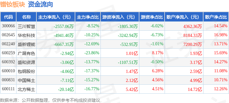 从资金流向上来看,当日镨钕板块主力资金净流出38.73亿元,游资资金净流入9.35亿元,散户资金净流入29.38亿元。镨钕板块个股资金流向见下表: