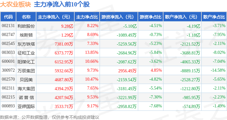 从资金流向上来看,当日大农业板块主力资金净流出15.1亿元,游资资金净流出1.41亿元,散户资金净流入16.51亿元。大农业板块个股资金流向见下表: