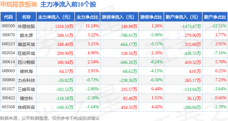 从资金流向上来看,当日甲烷排放板块主力资金净流出5809.34万元,游资资金净流入933.51万元,散户资金净流入4875.83万元。甲烷排放板块个股资金流向见下表:
