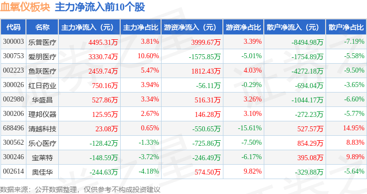 从资金流向上来看,当日血氧仪板块主力资金净流入4133.74万元,游资资金净流入5451.32万元,散户资金净流出9585.06万元。血氧仪板块个股资金流向见下表: