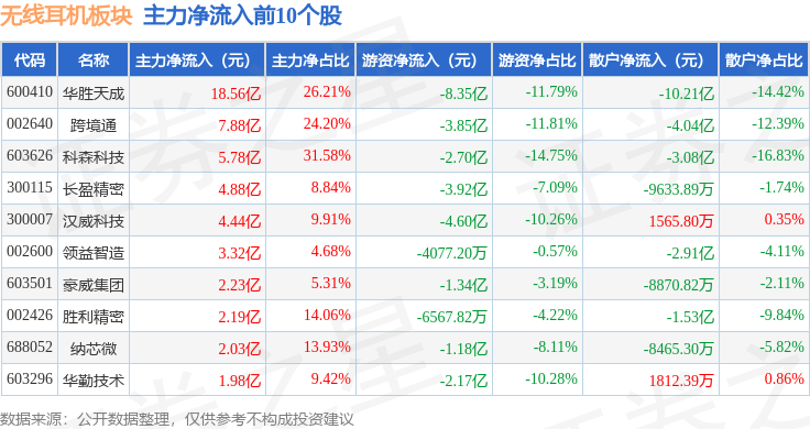 从资金流向上来看,当日无线耳机板块主力资金净流入2.21亿元,游资资金净流出17.56亿元,散户资金净流入15.35亿元。无线耳机板块个股资金流向见下表: