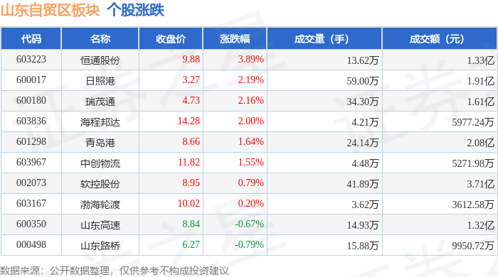 证券之星消息,9月16日山东自贸区板块较上一交易日上涨0.84%,恒通股份领涨。当日上证指数报收于3861.87,上涨0.04%。深证成指报收于13063.97,上涨0.45%。山东自贸区板块个股涨跌见下表: