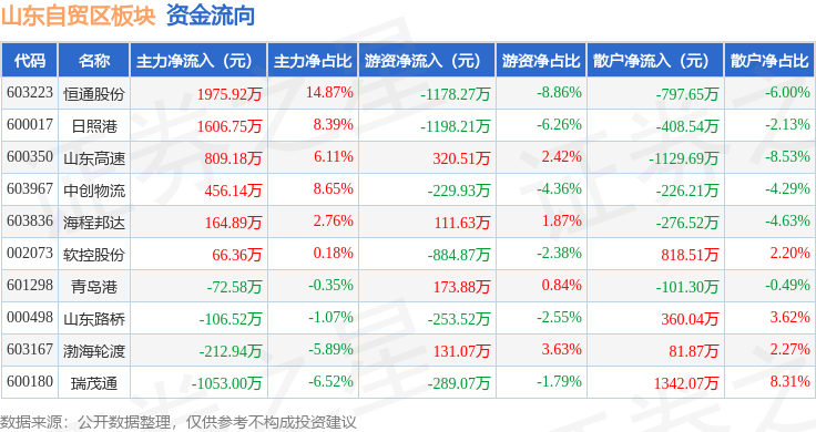 从资金流向上来看,当日山东自贸区板块主力资金净流入3634.21万元,游资资金净流出3296.79万元,散户资金净流出337.42万元。山东自贸区板块个股资金流向见下表:
