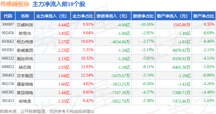 从资金流向上来看,当日传感器板块主力资金净流出1.48亿元,游资资金净流出11.62亿元,散户资金净流入13.1亿元。传感器板块个股资金流向见下表: