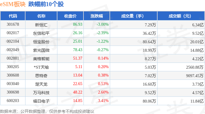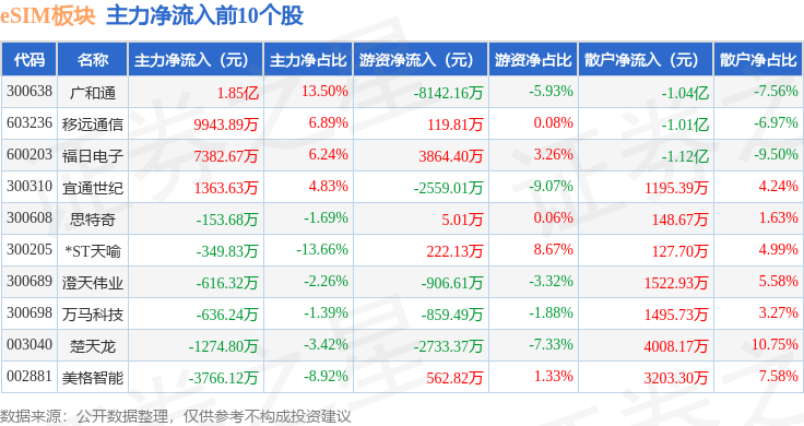 从资金流向上来看,当日eSIM板块主力资金净流出1.03亿元,游资资金净流出1.29亿元,散户资金净流入2.33亿元。eSIM板块个股资金流向见下表: