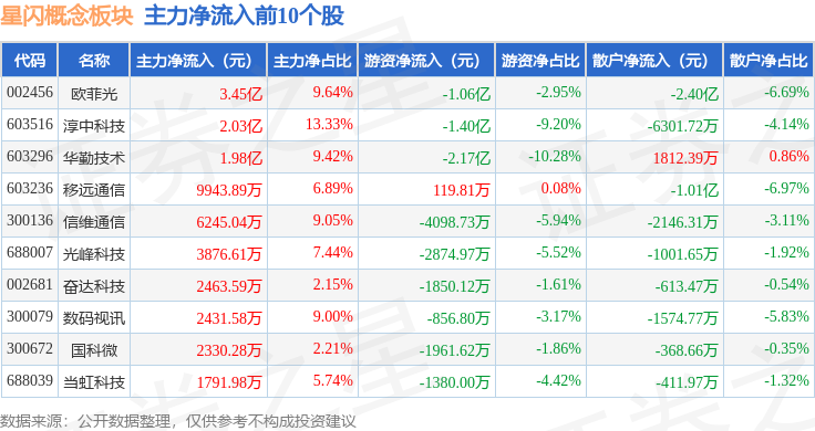 从资金流向上来看,当日星闪概念板块主力资金净流出4.26亿元,游资资金净流出5.84亿元,散户资金净流入10.1亿元。星闪概念板块个股资金流向见下表: