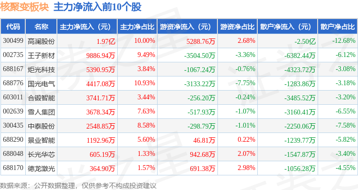 从资金流向上来看,当日核聚变板块主力资金净流出9.25亿元,游资资金净流入1.7亿元,散户资金净流入7.55亿元。核聚变板块个股资金流向见下表: