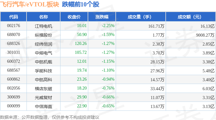 从资金流向上来看,当日飞行汽车/eVTOL板块主力资金净流出7.41亿元,游资资金净流出1.67亿元,散户资金净流入9.08亿元。飞行汽车/eVTOL板块个股资金流向见下表: