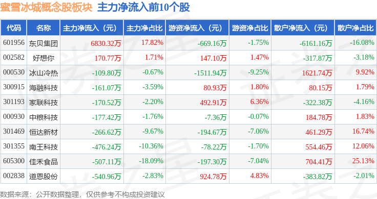 从资金流向上来看,当日蜜雪冰城概念股板块主力资金净流出5819.09万元,游资资金净流入1003.33万元,散户资金净流入4815.76万元。蜜雪冰城概念股板块个股资金流向见下表: