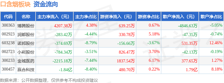 从资金流向上来看,当日口含烟板块主力资金净流出1.78亿元,游资资金净流入3958.07万元,散户资金净流入1.38亿元。口含烟板块个股资金流向见下表: