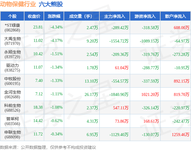 个股表现方面,动物保健行业当日领跌股为*ST绿康(002868),该股当日报收23.81,下跌4.34%,成交量2.47万,主力资金净流出289.42万元。大禹生物(871970)以下跌4.17%紧随其后,该股当日成交量9.2万,主力资金净流出1554.72万元。除此之外,永顺生物(839729)、驱动力(838275)、中牧股份(600195)均进入当日熊股之列。具体个股列表见下表:
