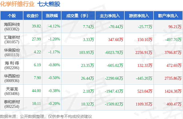 个股表现方面,化学纤维行业当日领跌股为海阳科技(603382),该股当日报收39.82,下跌4.12%,成交量7.74万,主力资金净流出70.44万元。汇隆新材(301057)以下跌1.2%紧随其后,该股当日成交量3.33万,主力资金净流入347.6万元。除此之外,华鼎股份(601113)、海 利 得(002206)、华西股份(000936)均进入当日熊股之列。具体个股列表见下表: