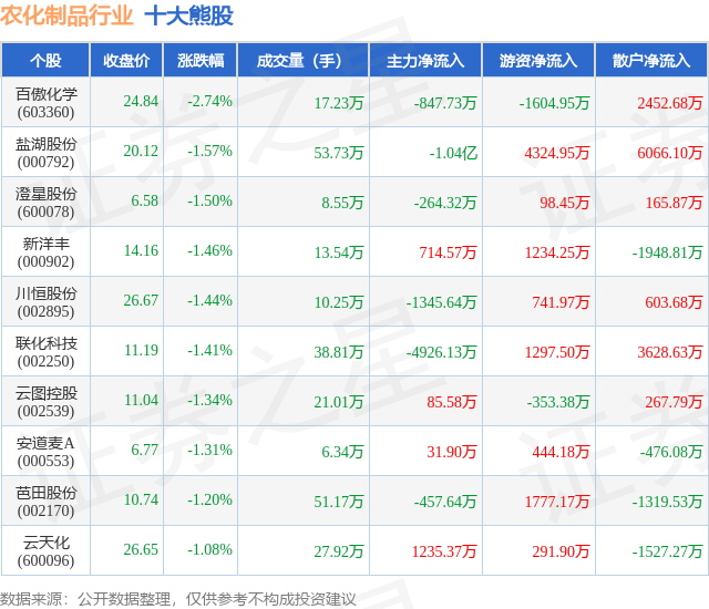 个股表现方面,农化制品行业当日领跌股为百傲化学(603360),该股当日报收24.84,下跌2.74%,成交量17.23万,主力资金净流出847.73万元。盐湖股份(000792)以下跌1.57%紧随其后,该股当日成交量53.73万,主力资金净流出1.04亿元。除此之外,澄星股份(600078)、新洋丰(000902)、川恒股份(002895)均进入当日熊股之列。具体个股列表见下表: