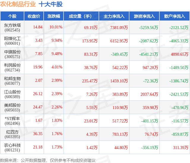 个股表现方面,农化制品行业当日领涨股为东方铁塔(002545),该股当日报收14.84,上涨10.01%,成交量69.19万,主力资金净流入7381.09万元。阳煤化工(600691)以上涨9.94%紧随其后,该股当日成交量173.95万,主力资金净流入6152.95万元。除此之外,中旗股份(300575)、利民股份(002734)、和邦生物(603077)均进入当日牛股之列。具体个股列表见下表: