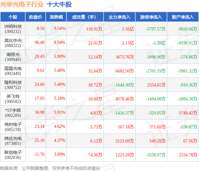 个股表现方面,光学光电子行业当日领涨股为洲明科技(300232),该股当日报收8.5,上涨9.54%,成交量118.91万,主力资金净流入1.56亿元。奥比中光(688322)以上涨8.94%紧随其后,该股当日成交量22.01万,主力资金净流入2.13亿元。除此之外,南极光(300940)、国星光电(002449)、隆利科技(300752)均进入当日牛股之列。具体个股列表见下表: