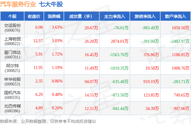 个股表现方面,汽车服务行业当日领涨股为交运股份(600676),该股当日报收6.0,上涨3.63%,成交量20.67万,主力资金净流出76.01万元。上海物贸(600822)以上涨3.03%紧随其后,该股当日成交量26.2万,主力资金净流入2874.01万元。除此之外,厦门信达(000701)、阿尔特(300825)、申华控股(600653)均进入当日牛股之列。具体个股列表见下表: