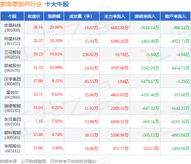 个股表现方面,家电零部件行业当日领涨股为宏昌科技(301008),该股当日报收38.16,上涨20.0%,成交量18.87万,主力资金净流入6602.38万元。同星科技(301252)以上涨10.1%紧随其后,该股当日成交量15.93万,主力资金净流入6386.2万元。除此之外,三花智控(002050)、顺威股份(002676)、汉宇集团(300403)均进入当日牛股之列。具体个股列表见下表:
