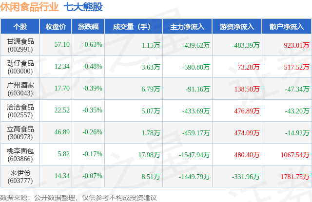 个股表现方面,休闲食品行业当日领跌股为甘源食品(002991),该股当日报收57.1,下跌0.63%,成交量1.15万,主力资金净流出439.62万元。劲仔食品(003000)以下跌0.48%紧随其后,该股当日成交量3.63万,主力资金净流出590.8万元。除此之外,广州酒家(603043)、洽洽食品(002557)、立高食品(300973)均进入当日熊股之列。具体个股列表见下表: