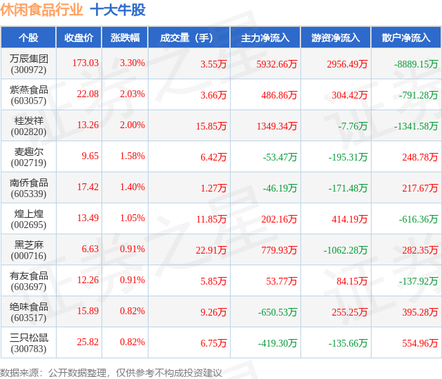 个股表现方面,休闲食品行业当日领涨股为万辰集团(300972),该股当日报收173.03,上涨3.3%,成交量3.55万,主力资金净流入5932.66万元。紫燕食品(603057)以上涨2.03%紧随其后,该股当日成交量3.66万,主力资金净流入486.86万元。除此之外,桂发祥(002820)、麦趣尔(002719)、南侨食品(605339)均进入当日牛股之列。具体个股列表见下表: